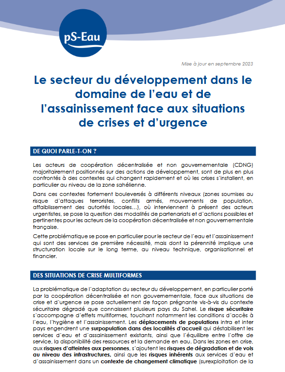 Chaque année le pS-Eau référence les projets portés par la coopération décentralisée et non gouvernementale française intervenant sur le secteur de l’Eau, de l’Assainissement et de l’Hygiène. Ce document recense les projets ou nouvelles phases de projets au Togo ayant bénéficié d’un financement de la part de collectivités territoriales et agences de l’Eau françaises et ayant débuté durant l’année 2023.