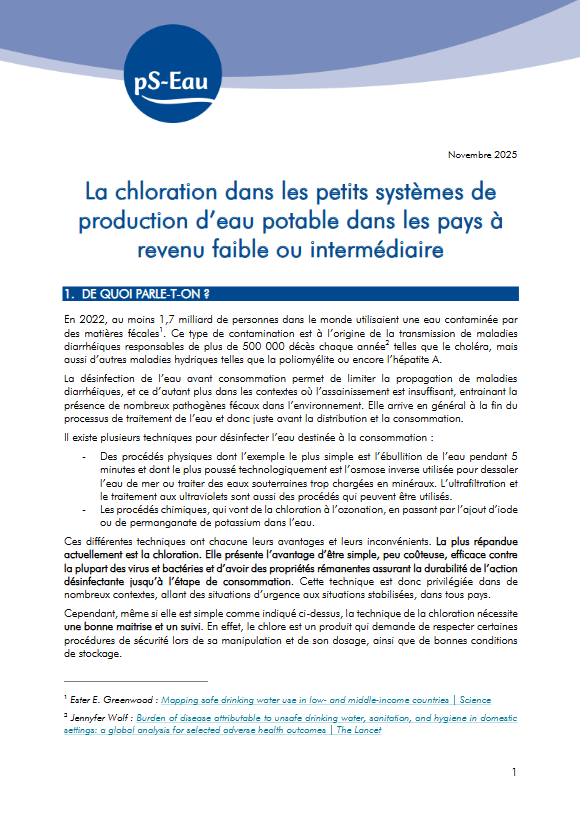 La chloration dans les petits systèmes de production d’eau potable dans les pays à revenu faible ou intermédiaire