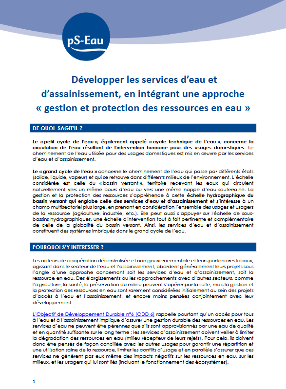 Les acteurs de la coopération décentralisée et non gouvernementale développent souvent leurs projets soit sur l’accès aux services d’eau et d’assainissement, soit sur la protection des ressources. Ces deux dimensions sont étroitement liées et devraient être mieux intégrées : la durabilité des services dépend directement de la qualité et de la disponibilité de la ressource, les systèmes d’assainissement ont un rôle clé dans la préservation des milieux aquatiques. L’Objectif de développement durable n°6 intègre d’ailleurs l’accès universel à l’eau et à l’assainissement et la gestion intégrée et durable des ressources en eau.